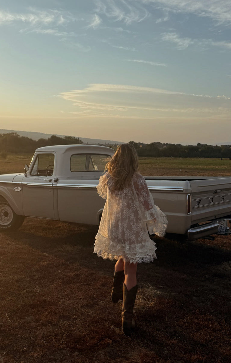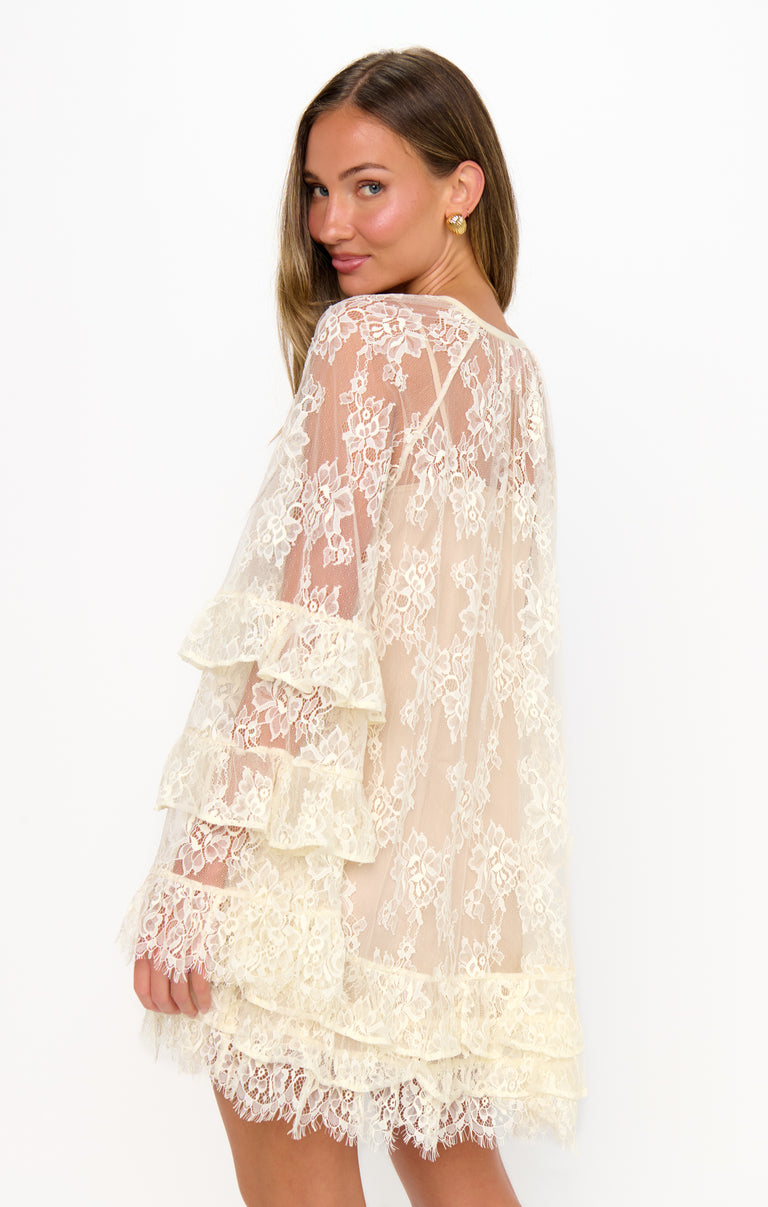 All eyes on lace in the Joelle! This head-turning mini is designed in sheer lace with soft ruffle details for a romantic, dreamy look. Finished with a built-in slip for just the right amount of coverage, it’s the perfect piece to dress up or down for any occasion.