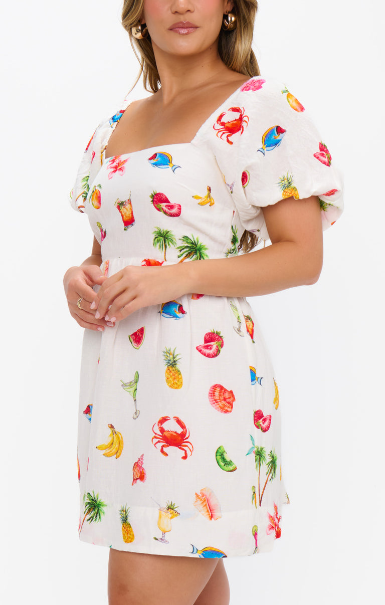 The Sightseeing Mini Dress is made for picture-perfect moments! Whether you're strolling charming streets or snapping pics at every landmark, this dreamy dress has you covered. Featuring puff sleeves and a square neckline, it’s the perfect mix of feminine and flirty. A smocked back adds comfort, while the empire silhouette flatters effortlessly. Finished in our playful island icons print, it’s your go-to for sightseeing and beyond!