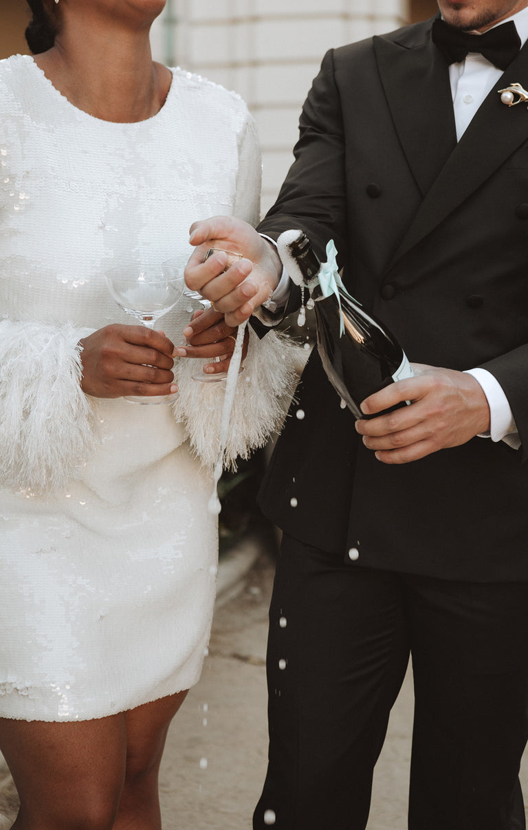 Get ready to dazzle at your next event with the super-groovy Priscilla Mini Dress! This fabulous piece features elegant long sleeves adorned with playful faux-feather trim and all-over sequins, adding just the right touch of glamour for a truly mesmerizing look. Plus, its chic silhouette will have you gliding gloriously across the dance floor!