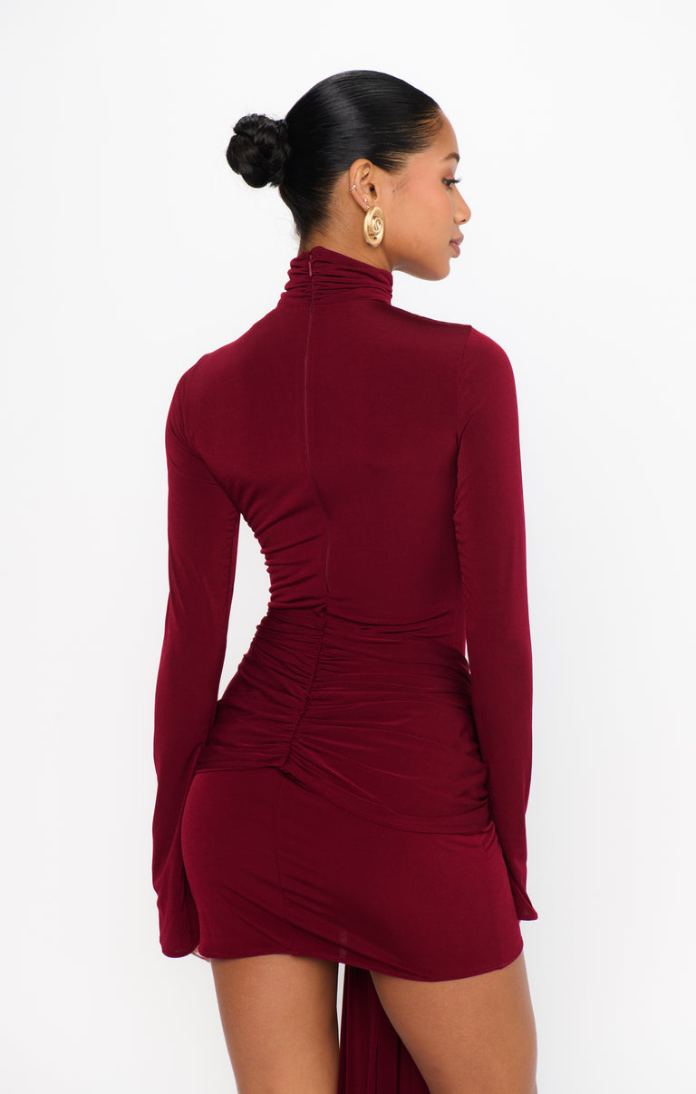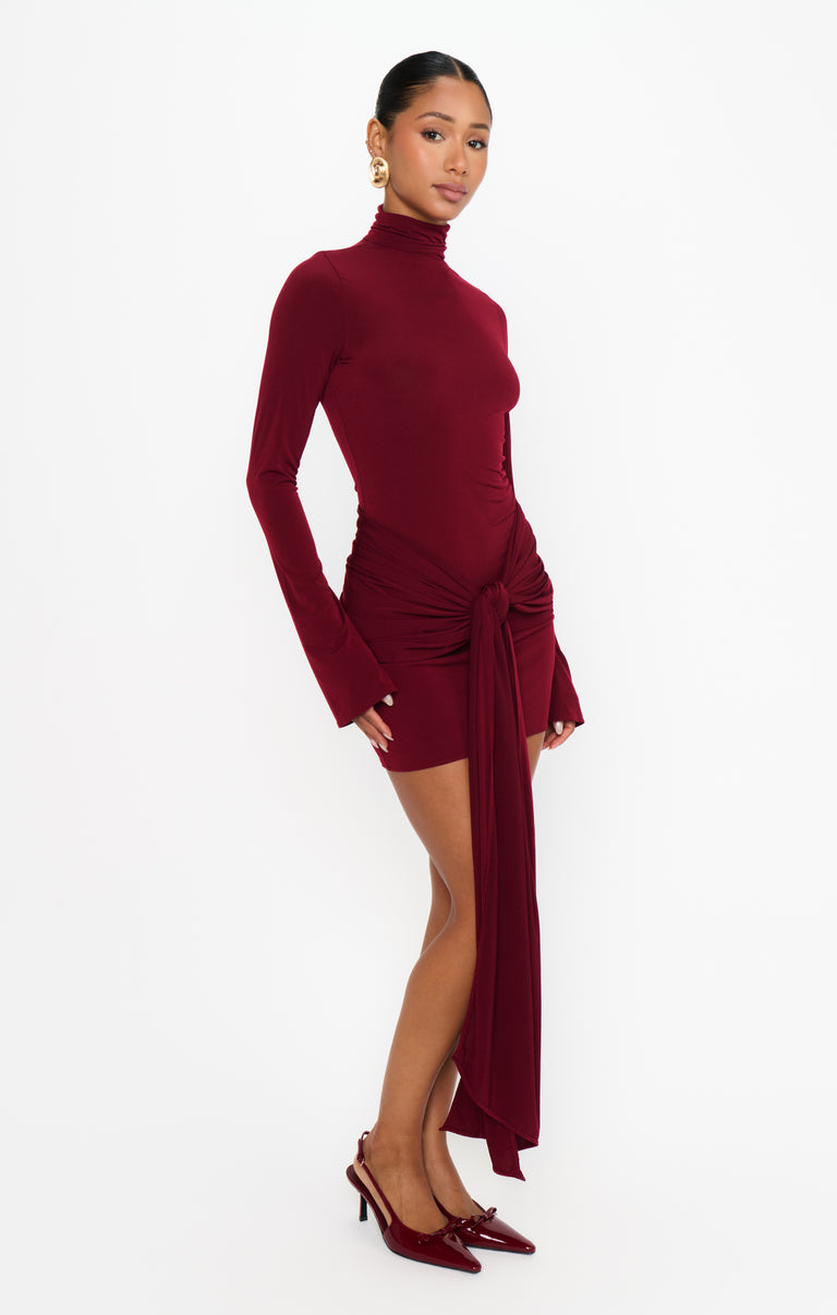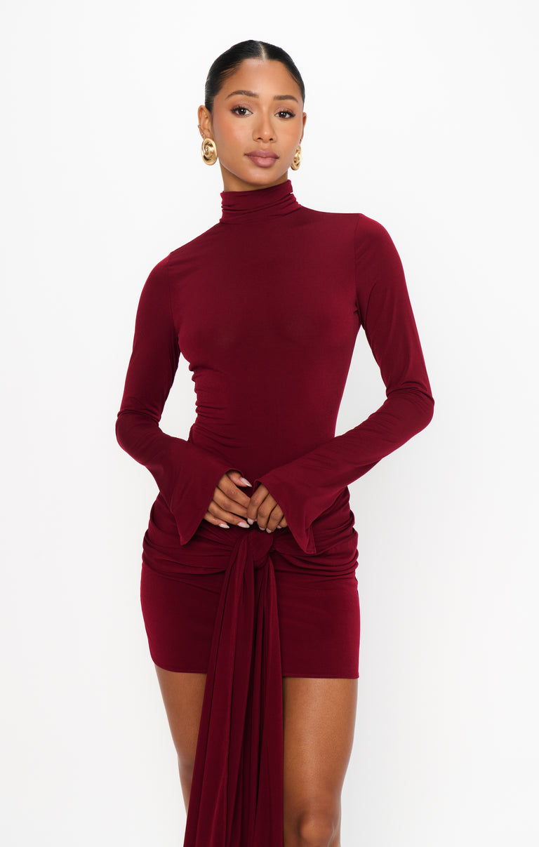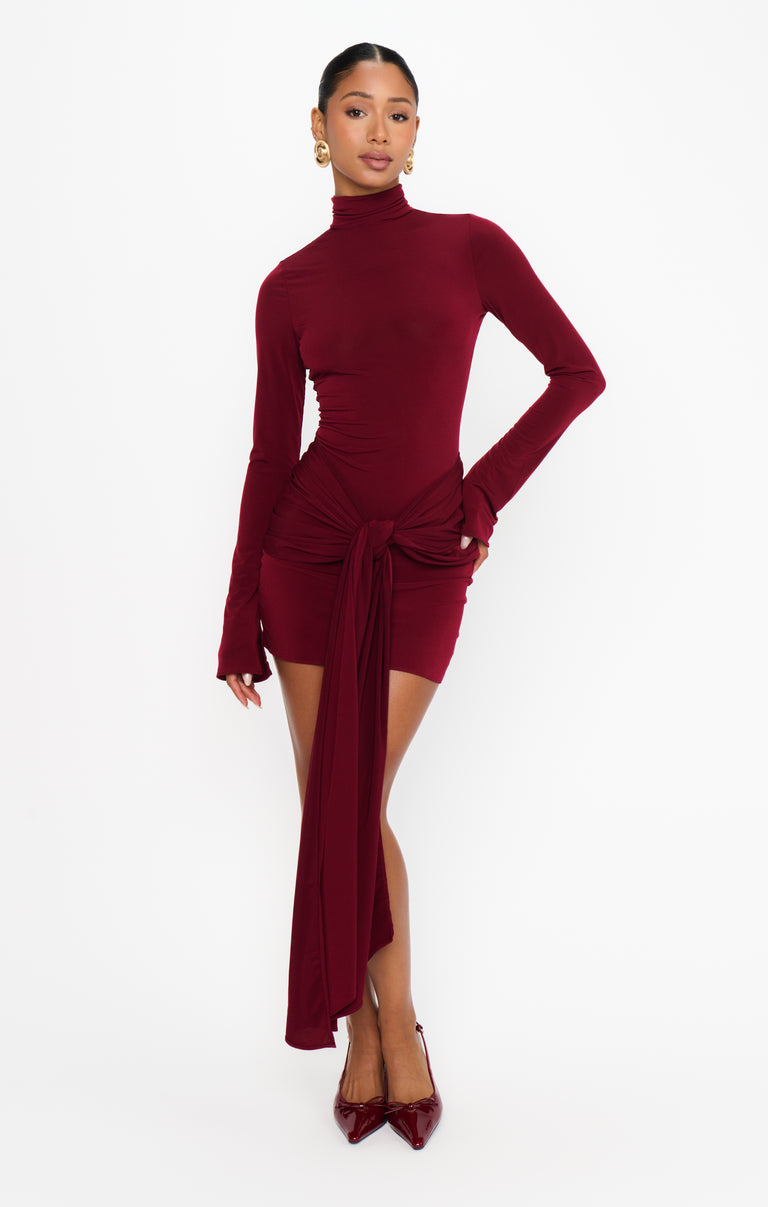 Turn every street into your runway in the Bleecker Mini, a showstopping silhouette in a rich wine hue. With a chic high neckline, figure-hugging bodice, and waist cinching tie, it flatters in all the right places and makes every night an unforgettable one!