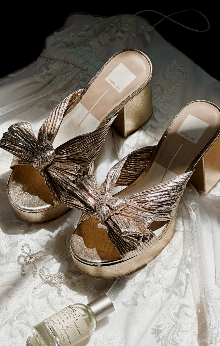 Chunky dimensions finished off with ultra feminine details. The Blare Bow silhouette is covered top-to-bottom in luxe, pleated fabric and topped with a statement bow. She’s perfect for a fun bridal look or any dressy occasion.