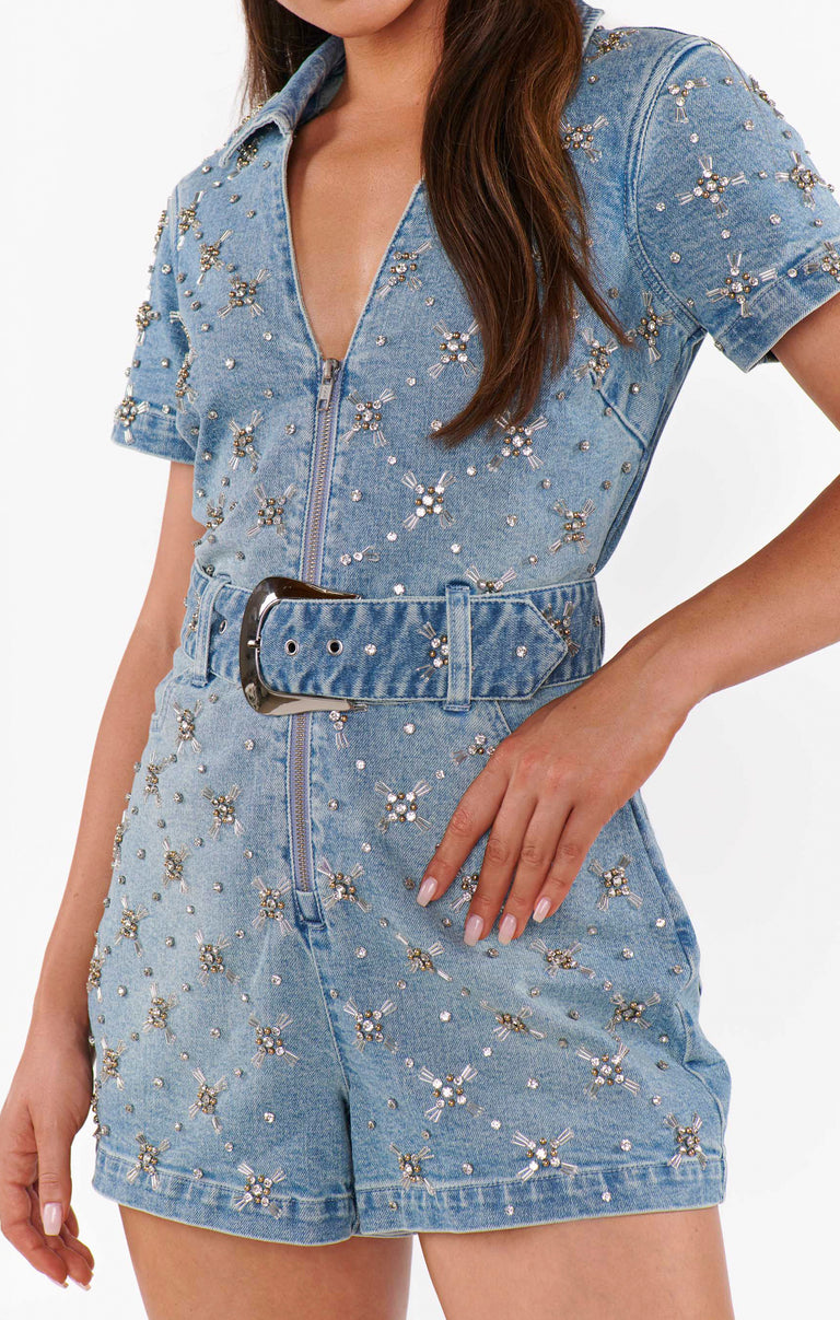 The Dolly Romper is a little bit country, a whole lotta sparkle. With a full front zip so you can control the vibe, sleek side slip pockets, and a waist-snatching belt make this a standout. Equal parts playful and polished, this romper is your one-and-done look for summer nights, festivals, or anytime you’re feeling a little extra!