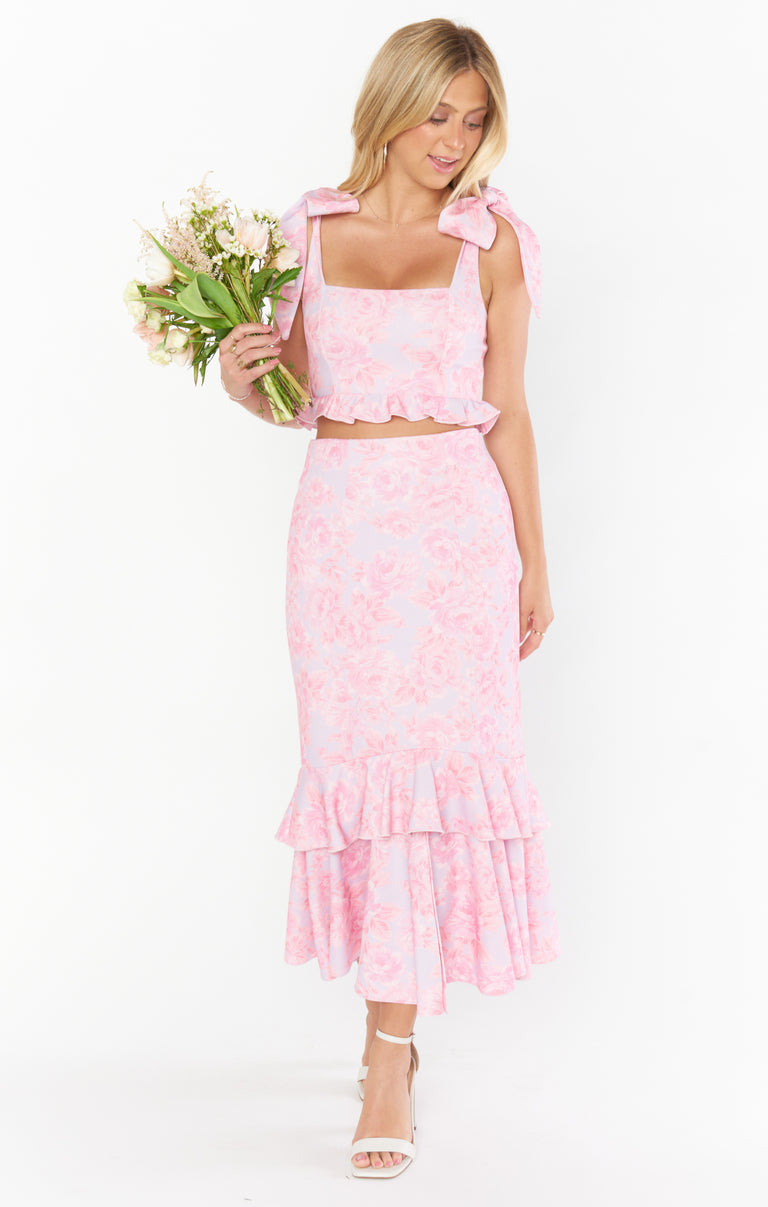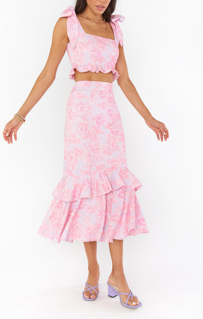 Get a lovely look for an evening out with the Dutches Ruffle Skirt! A charming blush floral print decorates stretch fabric as if forms a ruffled maxi with a flattering front slit. Complete the look with the Dutches Ruffle Top and pair with strappy heels and a clutch for the perfect event 'fit!