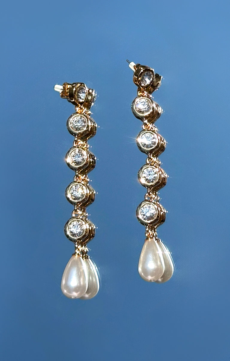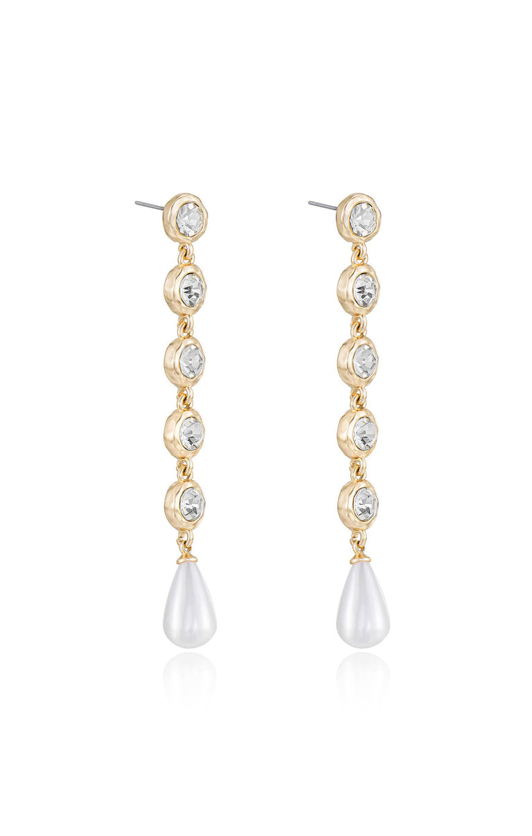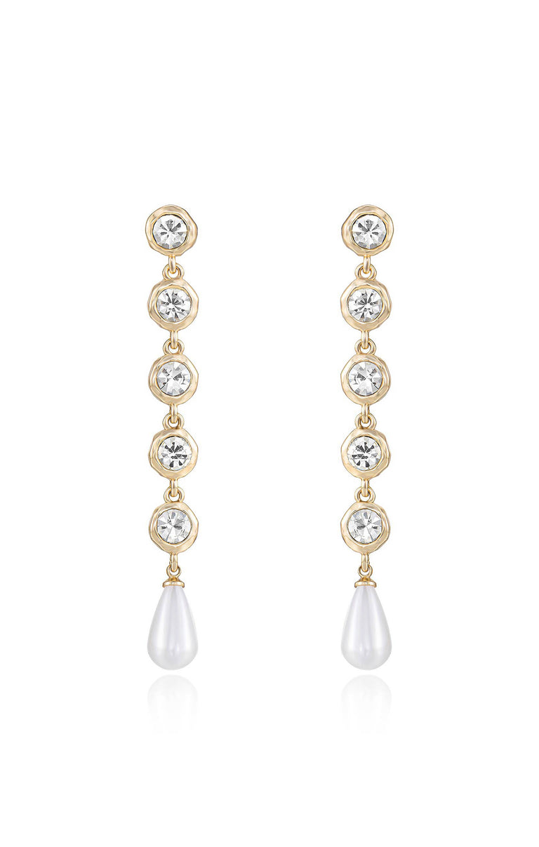 Linear drop earrings gleaming with crystals and imitation pearls bring whimsical movement to your ensembles.