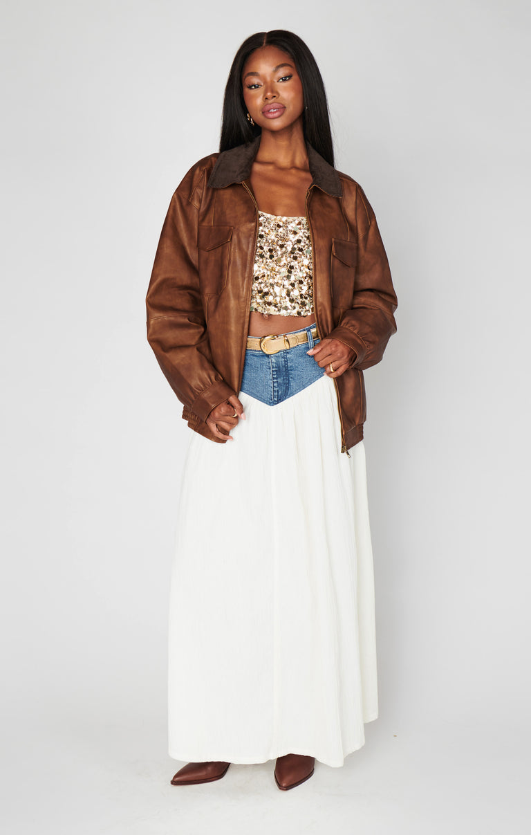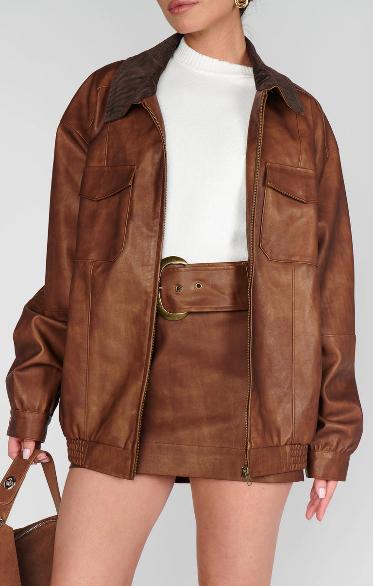 The coolest jacket in any room, the Maverick Bomber shines in rich chestnut brown faux leather and features multiple pockets for style and function. A must-have staple for every capsule wardrobe, it pairs perfectly with boots and the matching Maverick Mini Skirt!