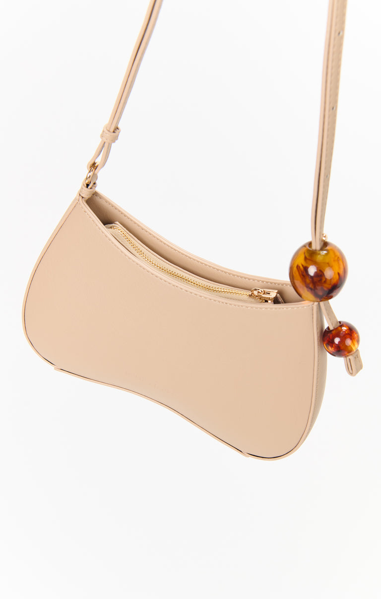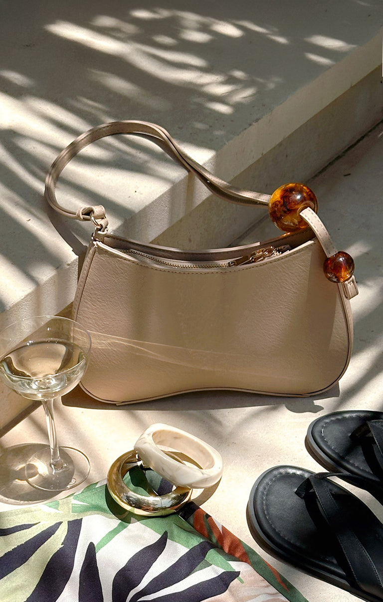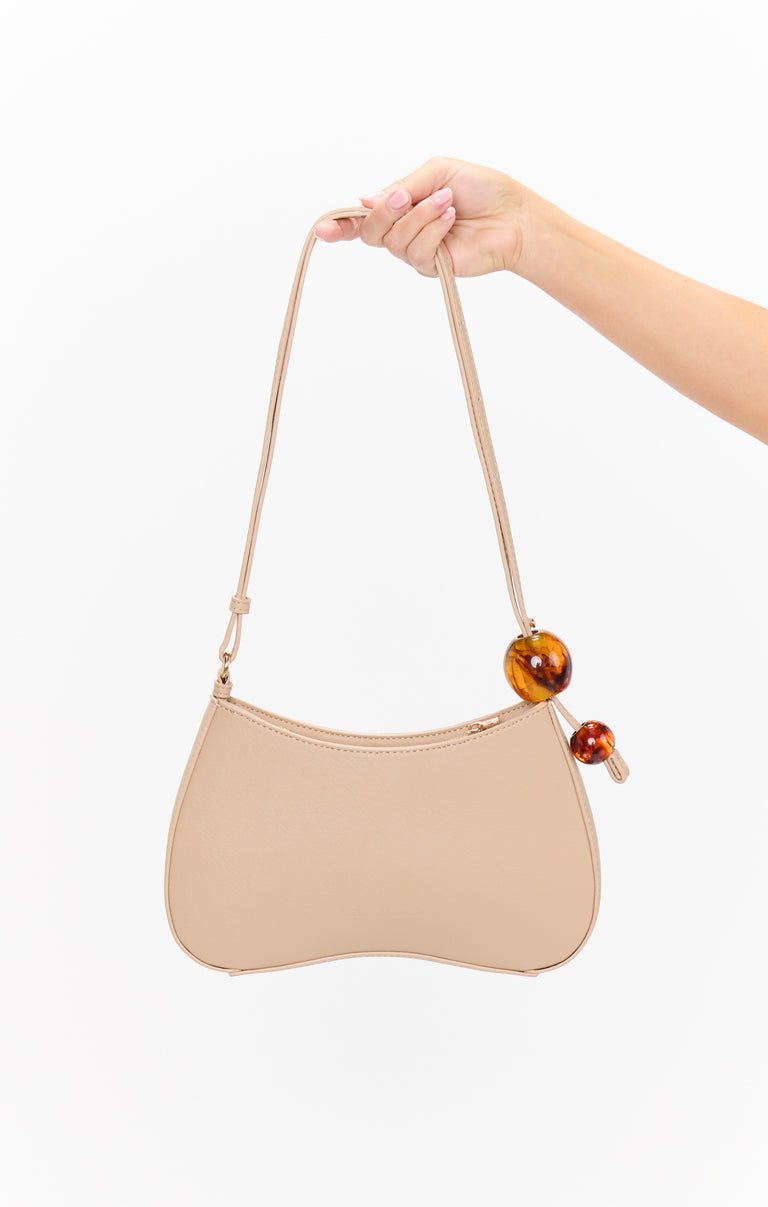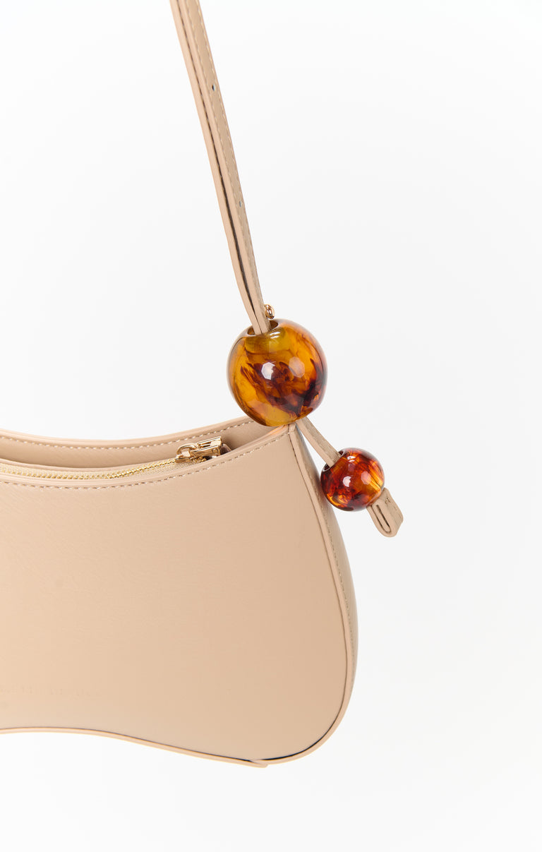 This shoulder bag stands out with its textured finish and chic resin bead accents. Designed for versatility, it has an adjustable strap, a zip pocket, and an interior slot pocket to keep your essentials organized - perfect for day or night!