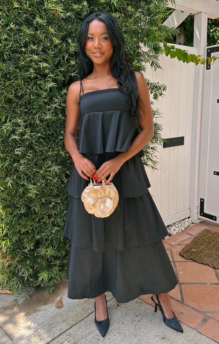 Easily elevate any look by adding this champagne top handle bag, featuring a charming flower silhouette.