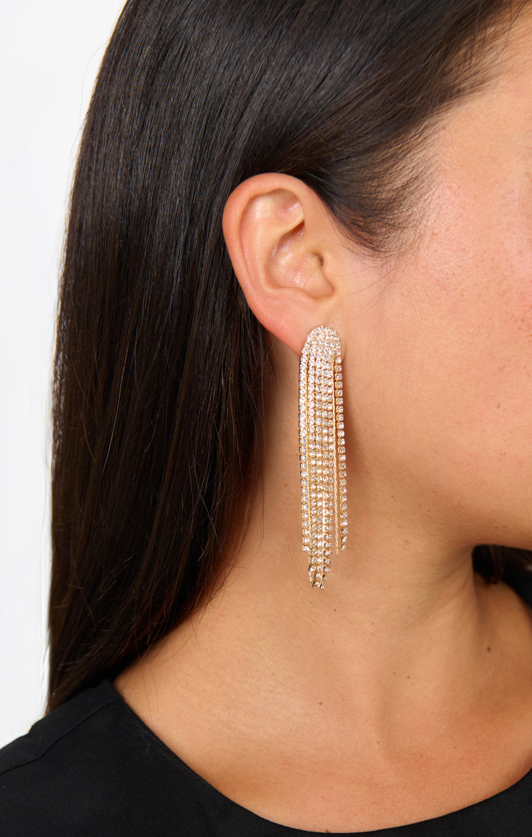 The only kind of earrings you want to wear out! Shiny gold snake chains and rhinestones bring the glam - just add your fave LBD and you’re set.