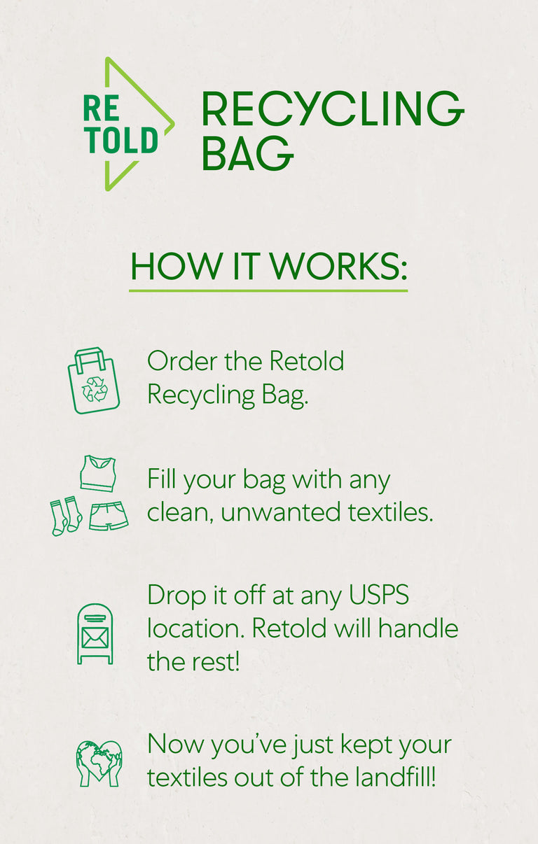 Other than getting the opportunity to save 15 lbs of textiles from being wasted! You get 3 Retold Bags upfront! All bags come Pre-labelled and with pre-paid postage.