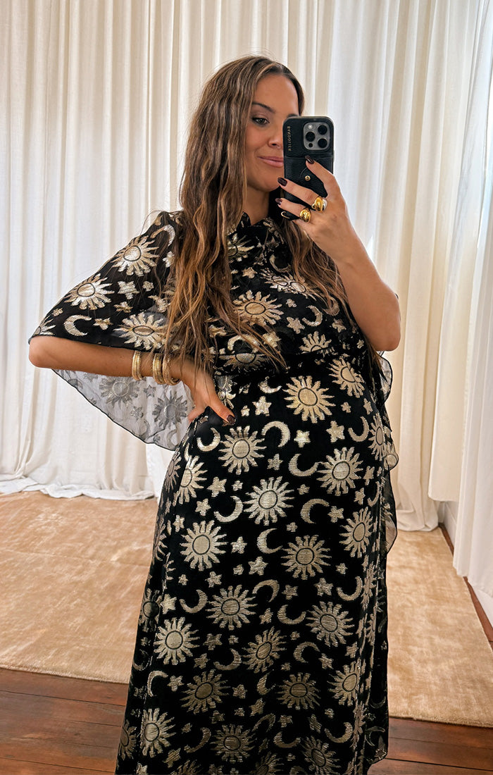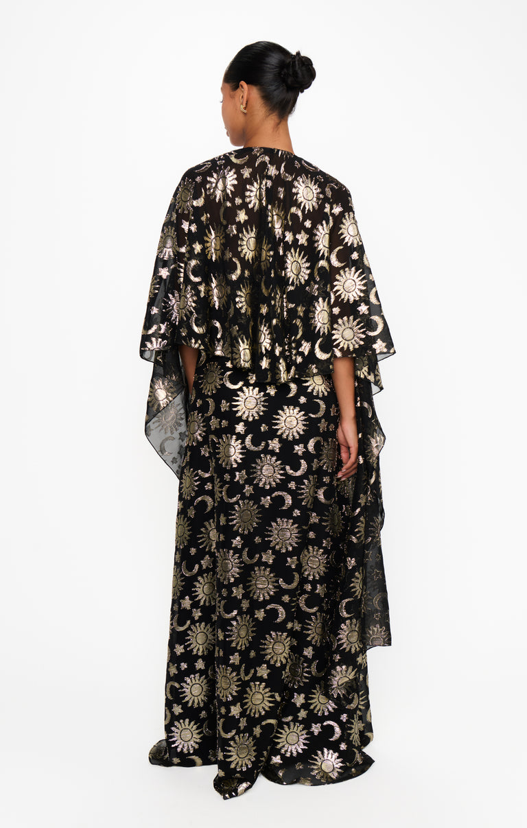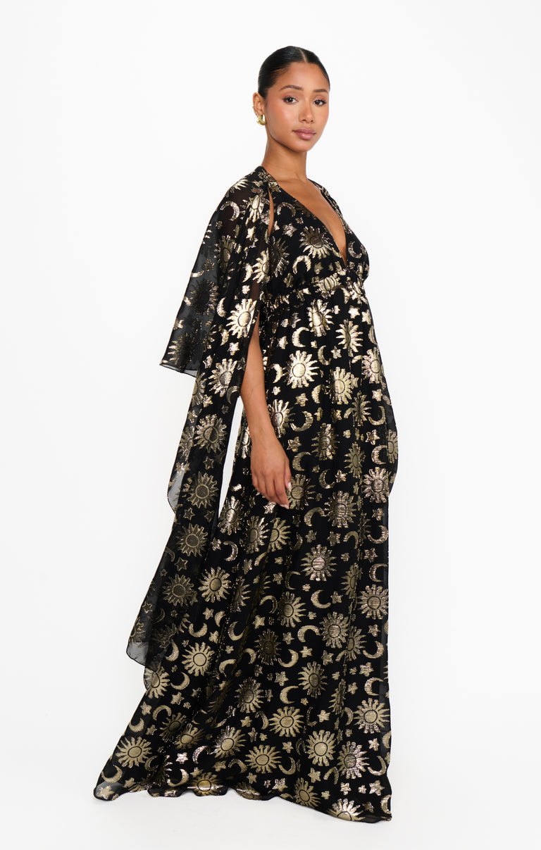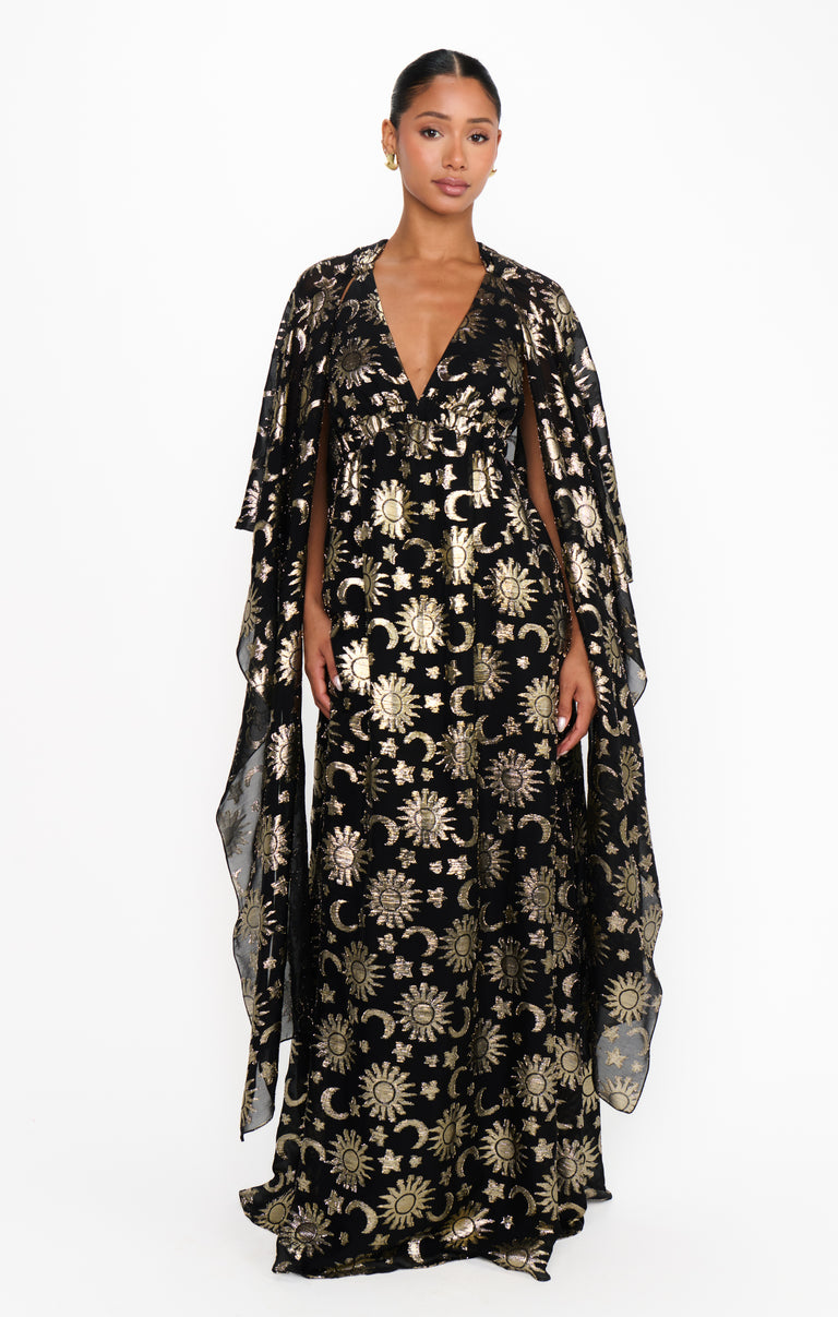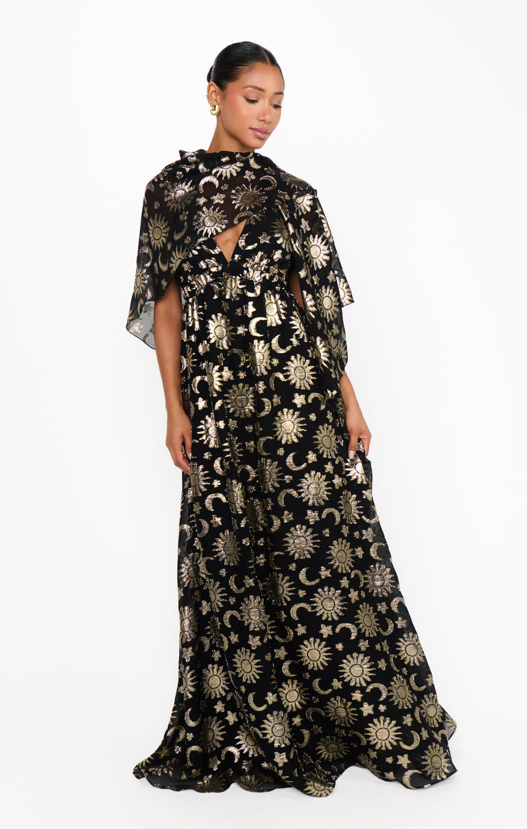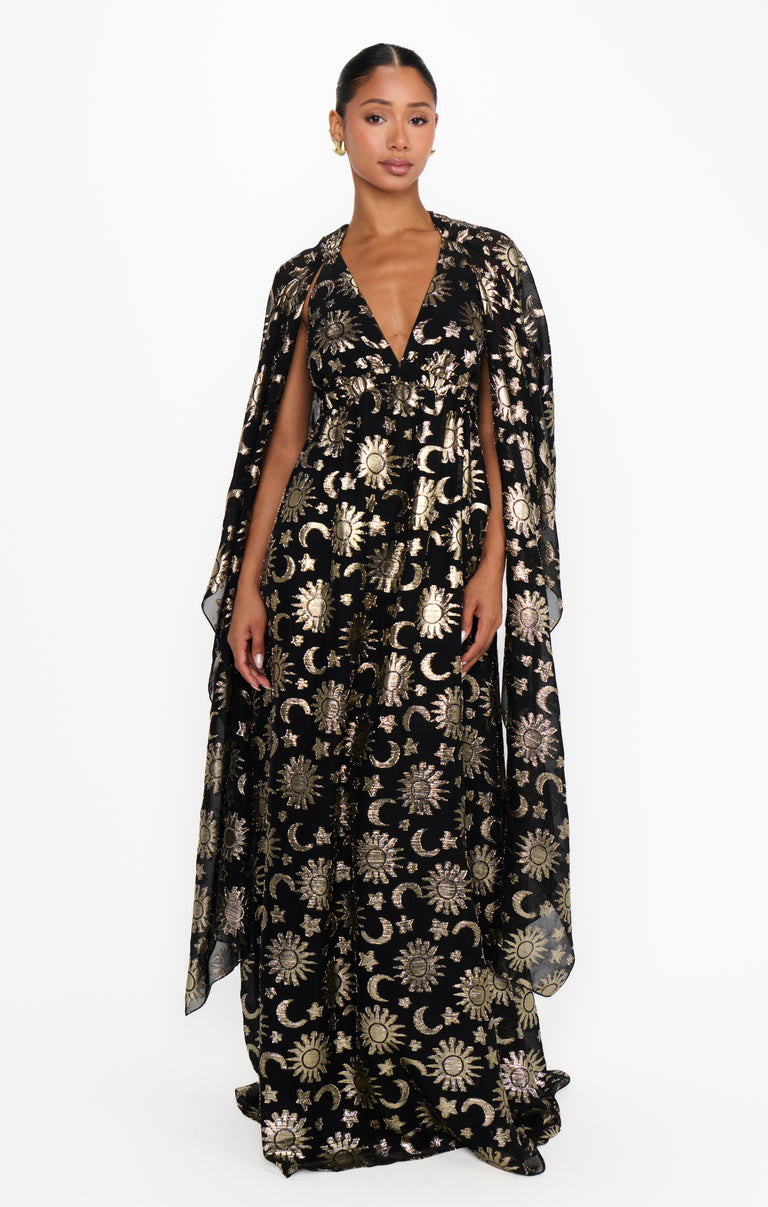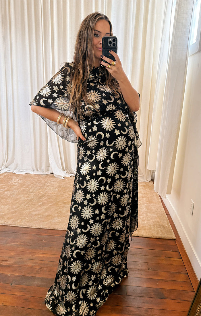 Written in the stars and your weekend plans, the Wanderlust Maxi Dress brings your celestial dreams to life! With an attached capelet for extra drama, it can be styled multiple ways - wear it open for a breezy, ethereal vibe or wrap it around for a little more coverage. Finished in an eye-catching starry print, it’s the ultimate showstopping, event-ready look!