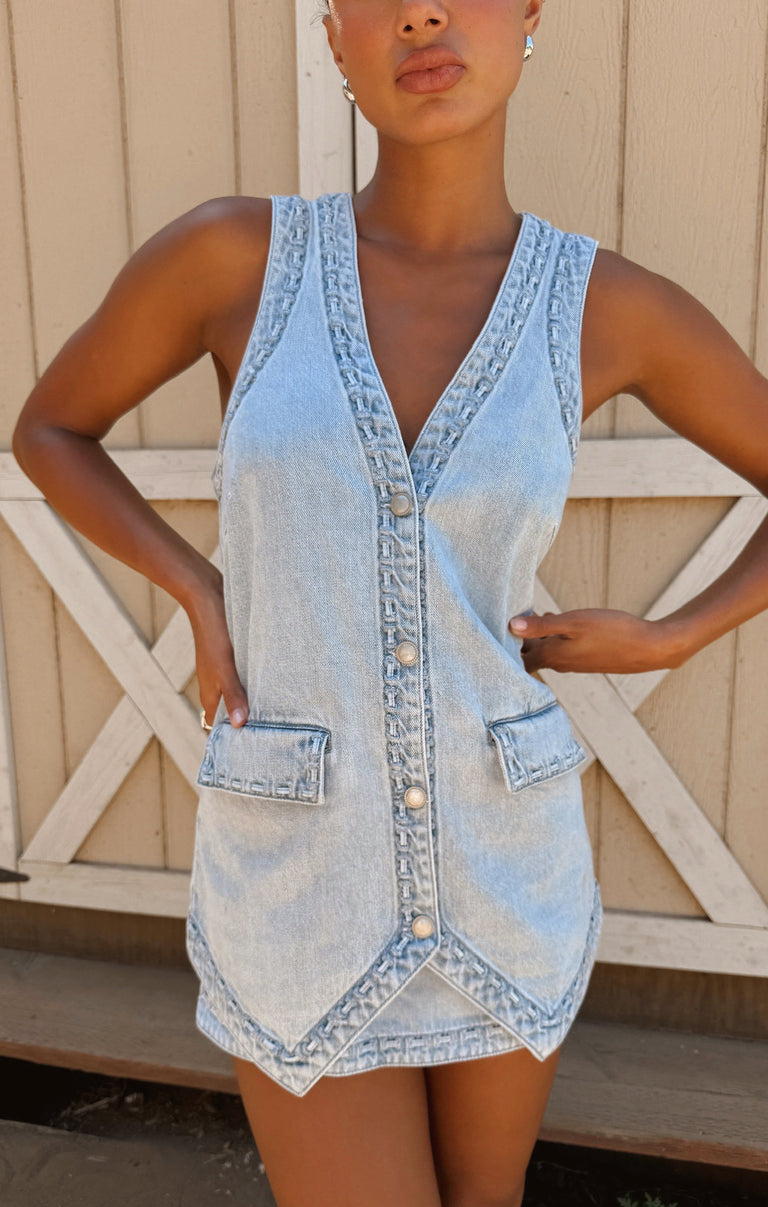 A modern take on a classic staple, the Wyatt Vest features a button front, flap pockets, and a stitched hem to finish the look. Pair it with the matching Wyatt Skirt for a cool, coordinated moment!